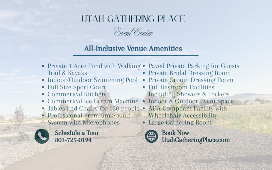 With modern amenities such as a full size sport court, indoor pool, commercial kitchen, and private pond; you’ll enjoy the best of both worlds—the comforts you need and the seclusion you crave. With both indoor and outdoor spaces available, your event is covered no matter the weather—rain or shine, the experience stays perfect. At Utah Gathering Place, every moment is an opportunity to celebrate, connect, and create memories that last a lifetime.